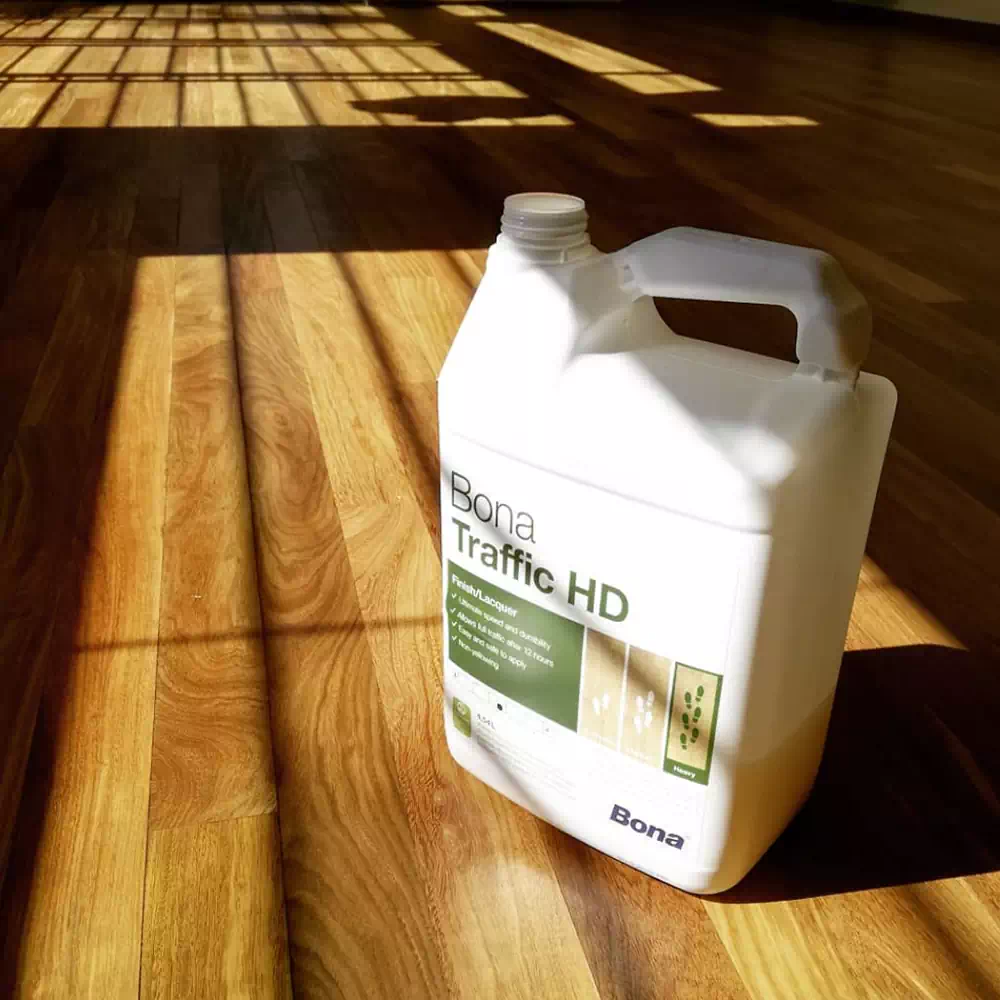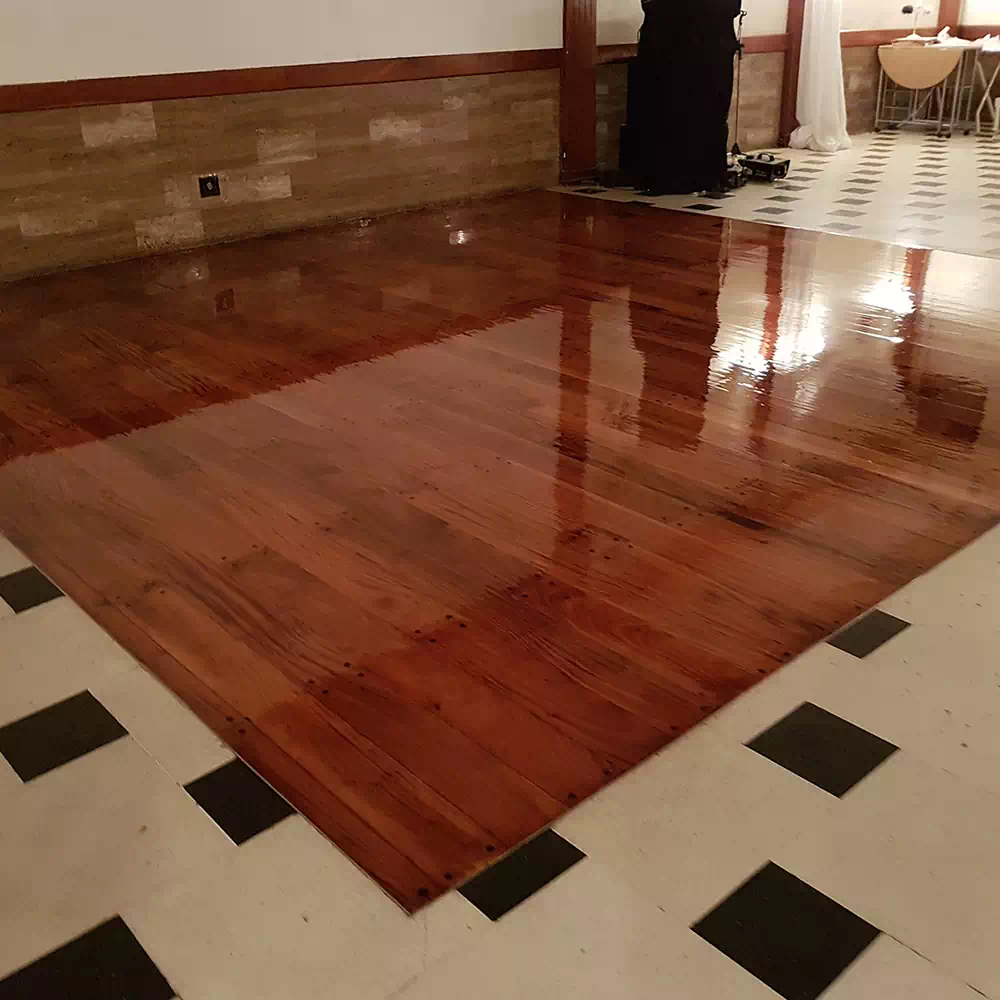 Usamos poliuretano al solvente para sellar, proteger y realzar el brillo del piso. Resiste rayas, manchas y facilita la limpieza.